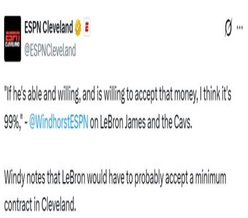 北京時間2月19日,ESPN名記文霍斯特在最新的播客節目中談到了詹姆斯休賽期重回克利夫蘭的可能性。他t表示,如果詹姆斯想要回到騎士,就可能得接受一份老將底薪。他說道:“如果詹姆斯愿意并且能夠接受一份底薪合同,那么他重返克利夫蘭騎士的可能性將高達99%。”