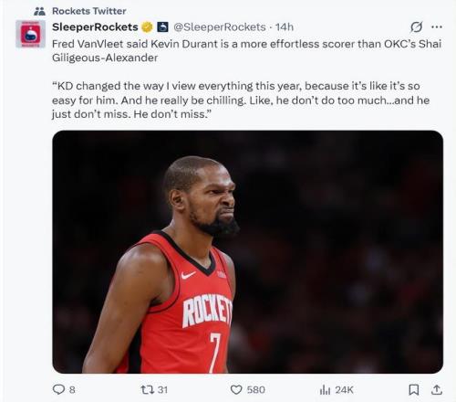 范弗利特在播客節(jié)目也這樣評(píng)價(jià)杜蘭特:杜蘭特今年改變了我對(duì)得分的看法,因?yàn)閷?duì)于他來說一切都太輕松了,他打得非常從容幾乎沒有過多的動(dòng)作,而且感覺他一出手就會(huì)進(jìn)球。