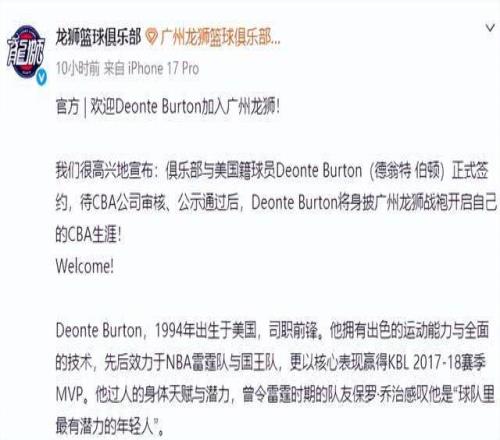 廣州男籃作為CBA第一階段大黑馬球隊之一,在沒有大手筆引援的情況下,取得了10勝12負的成績,在少賽一輪的情況下,目前暫列聯賽第十三名,整體表現遠超俱樂部預期。這個休賽期,廣州男籃又在積極調整外援陣容,俱樂部官宣裁掉了鋒線外援托馬斯,簽下NBA級后衛德翁特-伯頓。托馬斯第一階段的表現很不理想,場均出戰18.4分鐘貢獻8.5分5籃板2.4助攻,投籃命中率44.7%,三分命中率只有27.5%,攻防兩端的表現遠低于俱樂部的預期,被裁掉也在意料之中。為了提升球隊整體進攻實力,廣州男籃還是簽下了此前代表球隊參加過NBA夏季聯賽的德翁特-伯頓,后者待CBA公司審核、公示通過后,將身披廣州龍獅戰袍開啟自己的CBA生涯!