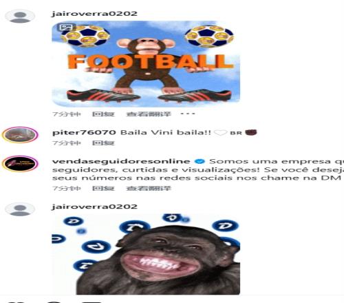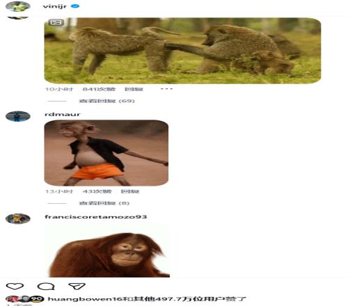 雖然不乏隊友以及球迷的支持評論,但是評論區還是被球迷不和諧的評論攻占。很多球迷在評論區曬出猩猩、猴子的表情包嘲諷維尼修斯。