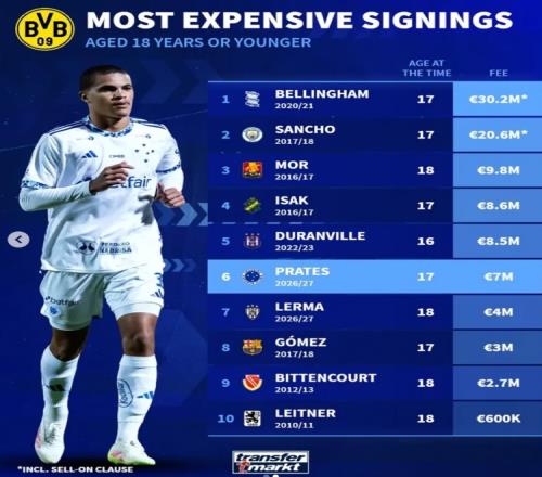 多特U18最貴引援榜:貝林厄姆壓桑喬居首,伊薩克、普拉特斯在列