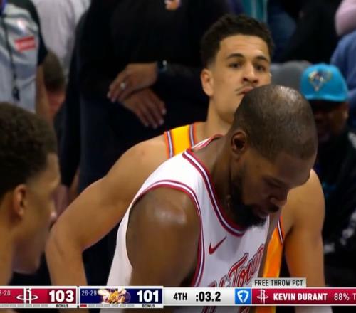 終場前3.2秒杜蘭特接球后被犯規,杜蘭特兩罰穩穩命中幫助火箭領先到4分,他與謝潑德是火箭罰球最穩定的點,這兩個罰球后黃蜂已經大勢已去,隨后黃蜂三分不中火箭涉險過關。