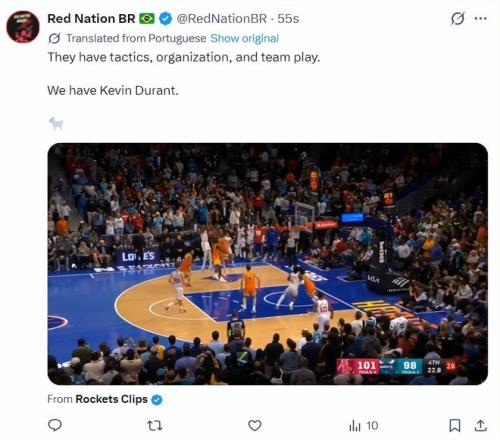 除了罰球的準絕殺之外,自終場前5分27秒申京一個勾手命中后(95-84),火箭余下的5分26秒里只有杜蘭特一人得分,杜蘭特包攬了火箭全隊的最后10分。