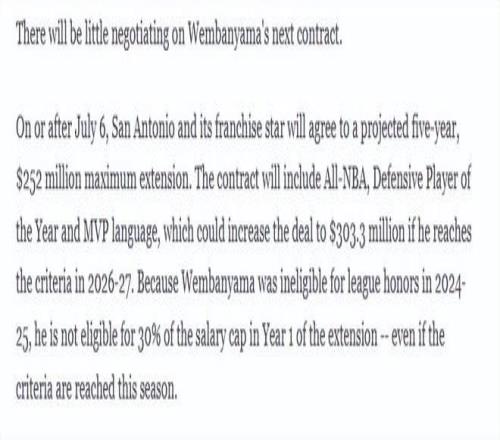 由于文班亞馬在2024-25賽季沒有資格參評聯盟獎項,即便本賽季達標,他續約第一年的薪資也無法占到工資帽的30%。