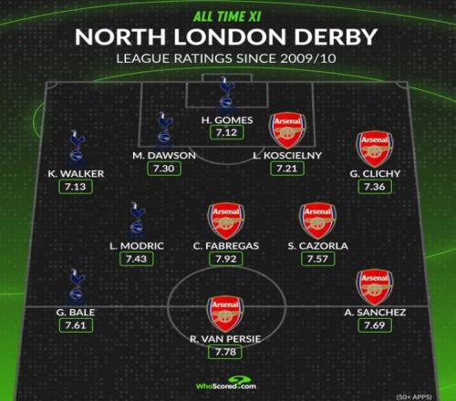 Whoscored自0910賽季北倫敦德比最佳陣:貝爾、范佩西、魔笛在列