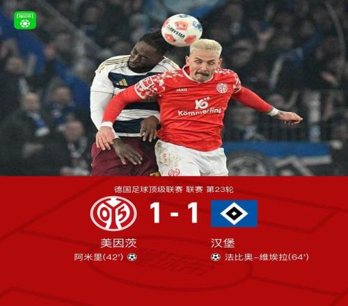 北京時間2月21日德國足球頂級聯(lián)賽 聯(lián)賽 第23輪,美因茨主場對陣漢堡。上半場,達(dá)科斯塔傳中,阿米里凌空掃射破門。下半場,法比奧-維埃拉任意球擊中人墻變線入網(wǎng)。全場比賽結(jié)束,美因茨1-1漢堡。