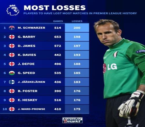 英超歷史輸球場次榜:施瓦澤200場最多、普勞斯175場第10