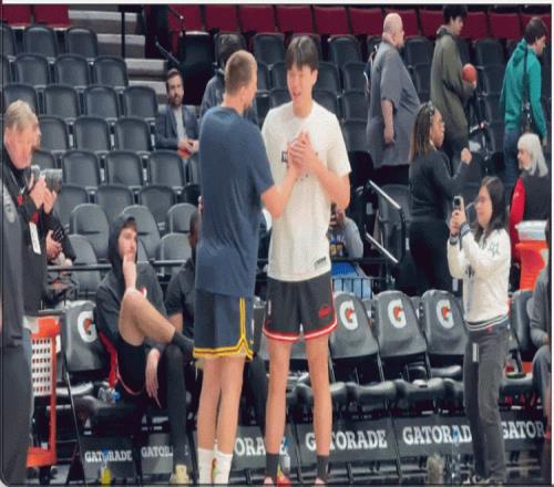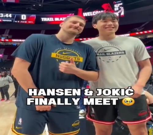 楊瀚森賽前和偶像約基奇聊天,并擁抱合影,楊瀚森對約基奇說道:“我不是真想親你。”