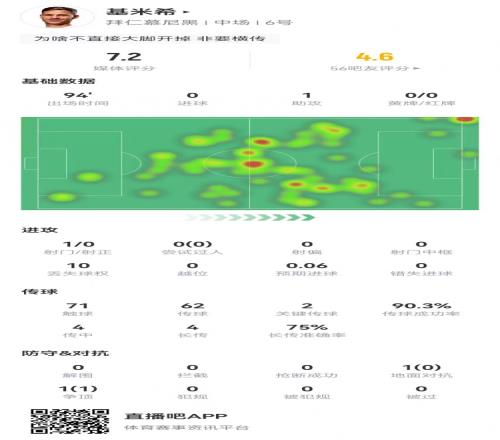 體育播報(bào)2月22日宣 拜仁在本輪德甲對(duì)陣法蘭克福,基米希本場(chǎng)數(shù)據(jù)如下: