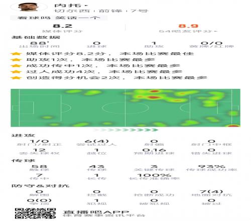 內托本場數據:1次助攻,3次關鍵傳球,0射正,4次成功過人