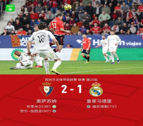 北京時間2月22日西班牙足球甲級聯賽 聯賽 第25輪,奧薩蘇納主場對陣皇家馬德里。奧薩蘇納布季米爾破門,勞爾-加西亞破門。皇家馬德里維尼修斯破門。最終比分奧薩蘇納 2-1 皇馬。