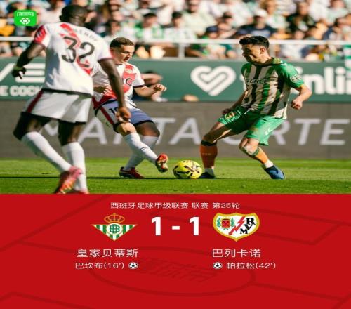 北京時間2月21日西班牙足球甲級聯賽第25輪,皇家貝蒂斯主場對陣巴列卡諾。巴坎布率先破門。帕拉松扳平比分。最終比分皇家貝蒂斯1-1巴列卡諾。