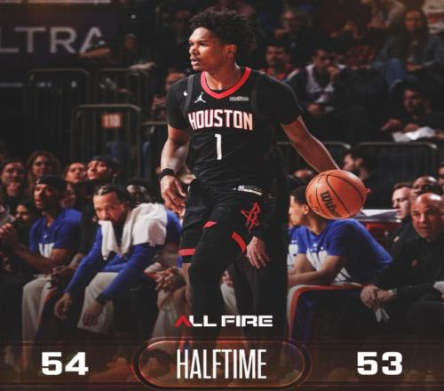 申京內線轉身暴扣、弧頂三分球連拿5分,火箭將分差縮小至1分。唐斯迎著防守強投三分命中打破得分荒,杜蘭特加速突破完成暴扣,隨后再造殺傷兩罰全中,半場戰罷,火箭54-53反超尼克斯。