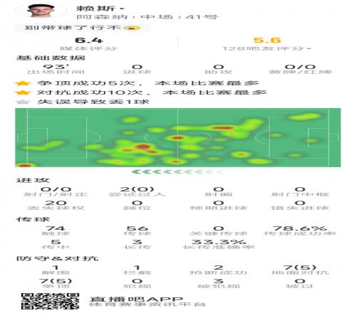 體育播報2月23日宣 在本輪英超,阿森納4-1大勝熱刺。本場比賽賴斯失誤送禮,以下為他在本場數據: