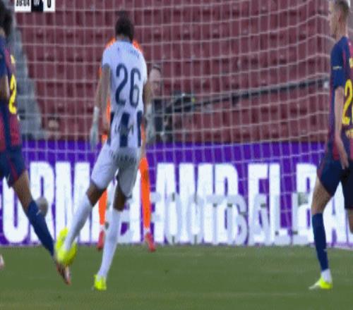 第46分鐘,下半場(chǎng)比賽開(kāi)始之前,巴薩球員換回英文球衣