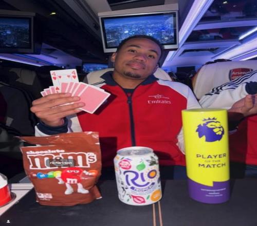 賽后,加布里埃爾曬出他在球隊大巴上的照片,照片中前方放著英超官方全場最佳球員獎杯,這位阿森納后衛手里還拿著撲克牌,并特意亮出了紅桃4(可能代表他最近4次英超北倫敦德比出場都當選全場最佳)。