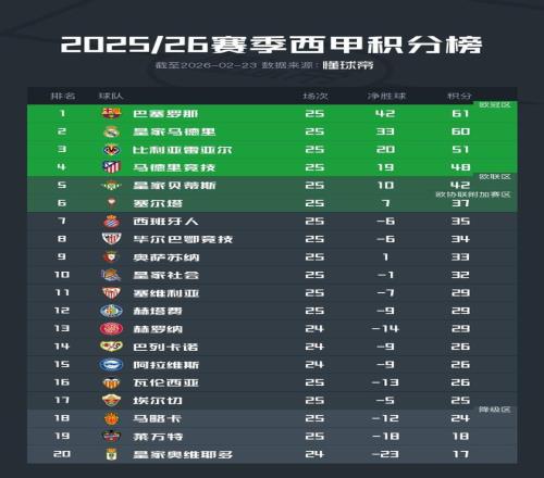 比利亞雷亞爾、馬德里競技分居積分榜第三、第四,目前身處歐冠區。皇家貝蒂斯排名第五處于歐聯區。排名第六的塞爾塔領先西班牙人2分身處歐協聯附加賽區。