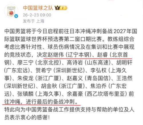 今天早上,中國男籃公布了一則重要消息,沒錯,那就是2027世界杯預選賽,第二窗口期的參賽球員,已經是基本出爐,此番,郭士強一共帶了14名球員前往日本,準備2月26日與日本隊的比賽。郭士強之所以會帶14名球員前往,有一個重要因素,就是給球隊陣容,做更加充分地準備。