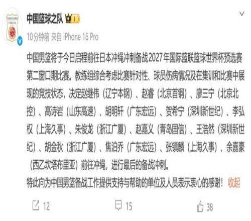 世預(yù)賽第二窗口期的比賽,中國(guó)男籃將先后對(duì)陣日本隊(duì)和中國(guó)臺(tái)北隊(duì),其中首戰(zhàn)于2月26日客場(chǎng)挑戰(zhàn)日本。日前,中國(guó)男籃已經(jīng)從上海出發(fā),飛往日本沖繩。中國(guó)籃球之隊(duì)也公布了出征的球員名單,郭士強(qiáng)將帶14人前往日本,賽前才會(huì)確認(rèn)最終的12人大名單,這也與媒體人付政浩對(duì)郭指導(dǎo)嚴(yán)謹(jǐn)細(xì)膩風(fēng)格的推測(cè)相吻合。