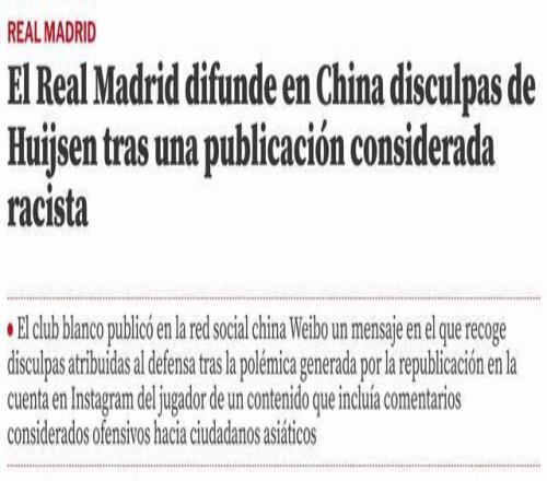 馬卡與世體報道了赫伊森轉發辱華內容的事件,并寫道:“皇家馬德里俱樂部在其官方微博賬號上發表了聲明,該賬號主要面向中國用戶,這條微博引發了中國球迷的強烈批評,他們質疑道歉的誠意,并要求俱樂部在國際平臺上發表公開聲明或發布視頻,而不僅僅是一份書面聲明。”同時,兩家媒體也介紹,皇馬在2024年也曾卷入此類事件。