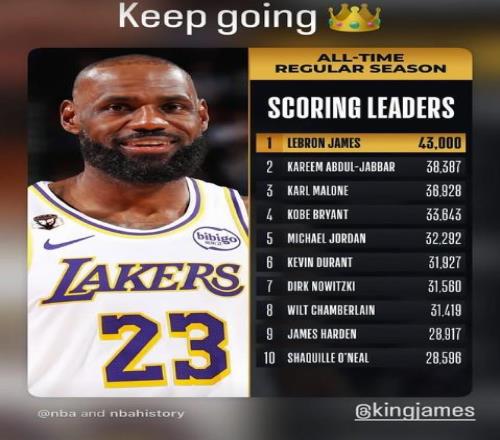 在2023年2月7日湖人對陣?yán)做谋荣愔校诚?8分,超越卡里姆-阿卜杜勒-賈巴爾,登上常規(guī)賽生涯得分榜榜首。詹姆斯在2025年12月30日年滿41歲,目前獨自一人高居歷史得分榜榜首。