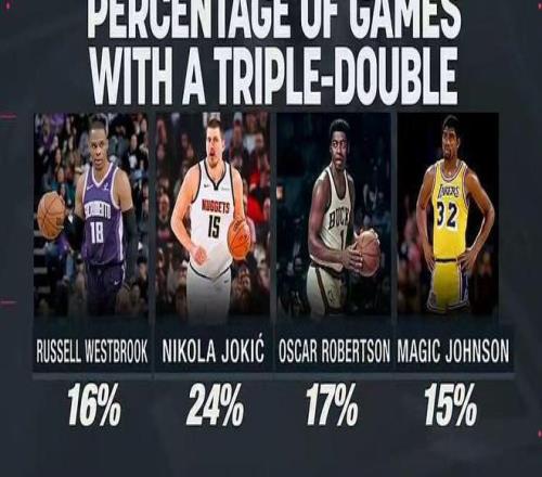 約基奇本賽季21次三雙高居聯(lián)盟第一,生涯185次三雙歷史第二,僅次于威少207次三雙,生涯三雙率高達24%。