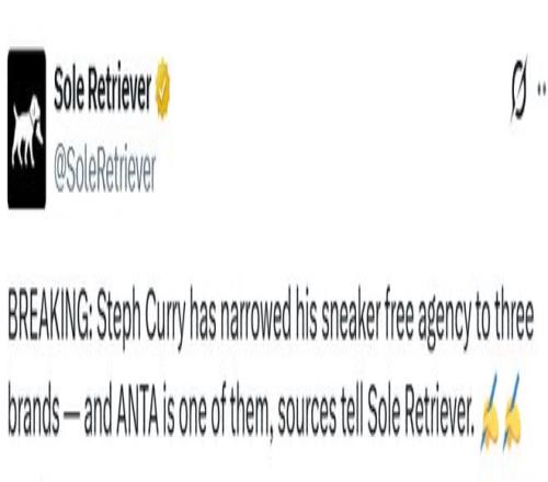 北京時間2月23日,據媒體Sole Retriever報道,斯蒂芬-庫里已將球鞋品牌候選縮小到三家,安踏就在其中。