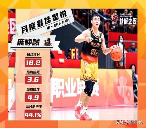 在常規賽10-23輪的比賽中,龐崢麟出戰14場。在他場均出場的32分鐘里,能夠得到15分、2.8籃板、5.8助攻的數據,罰籃命中率82.3%。龐崢麟在本月度4次得到20+的單場得分,其中包含一場26分、8籃板、13助攻的“準三雙”數據。