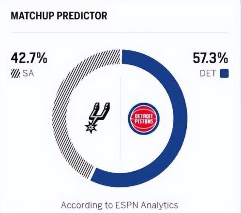 反觀馬刺,近期的狀態火熱,憑借一波8連勝,拿到40勝16負的戰績,位居西部第二,與雷霆的差距只有3個勝場,并甩開身后的掘金5個勝場差。馬刺隊過去兩場主場比賽分別擊敗太陽和國王,延續了連勝勢頭。上一場對陣國王,馬刺以139比122兵不血刃取勝,核心文班亞馬延續無解表現,拿下28分15個籃板6次助攻的全面數據,帶領球隊多點開花、輕松取勝。此役,活塞的杜倫與內線怪物文班亞馬的較量,無疑看點十足。賽前,美媒ESPN預測本場比賽,馬刺取勝的概率為42.7%,活塞勝率57.3%。