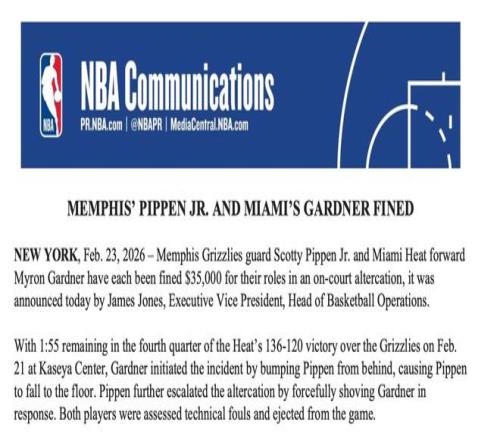 北京時間2月24日,NBA官方開出罰單,宣布此前在場上互毆的小皮蓬與加德納均罰款3.5萬美元。