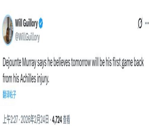 鵜鶘后衛穆雷自2025年2月1日右腳跟腱撕裂后一直缺陣至今,如今他即將復出。另一位記者羅德-沃克消息,這位前全明星球員已在上周四、周五參加了完整訓練。