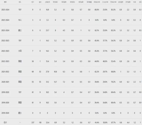 常規(guī)賽出戰(zhàn)237場首發(fā)118次,場均上陣23.7分鐘拿到8.9分5.2板1.2助進賬,三項命中率41.4%、30.9%和67.7%;季后賽出戰(zhàn)七場,場均上陣18分鐘收獲6.6分6.7板,三項命中率41.9%、50%和90%。