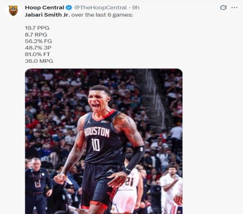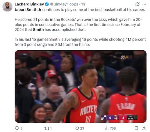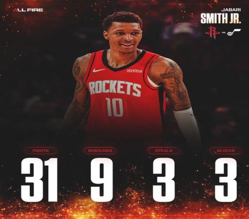 此役是小賈巴里-史密斯的表現(xiàn)是火箭最佳,全場(chǎng)比賽33分鐘,17中12,三分11中6,罰球2中1,拿到31分9籃板3搶斷3蓋帽,命中率70.6%,三分命中率54.5%,真實(shí)命中率69.2%,正負(fù)值+28。