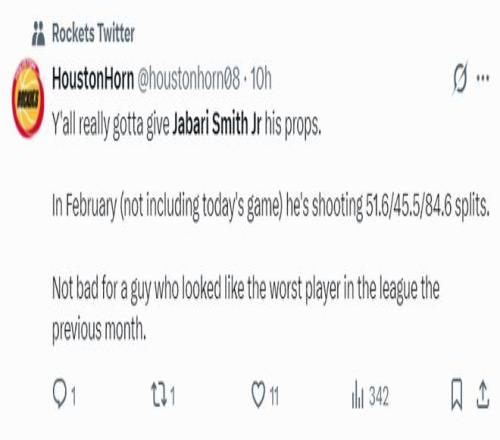 休媒:二月份小賈巴里-史密斯,投籃命中率51.6%,三分命中率45.5%,罰球命中率84.6%,他一月份還被認(rèn)為是最差的家伙,不得不說他有了巨大的進(jìn)步。