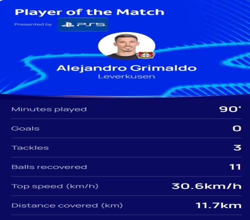 此役格里馬爾多為勒沃庫森踢滿全場,11次奪回球權,他當選歐冠官方本場比賽最佳球員。