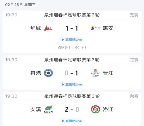 體育播報02月25日宣 泉州市首屆“迎春杯”足球聯賽今天結束3場比賽的爭奪,鯉城點球大戰擊敗惠安,晉江、安溪獲勝,本文為大家帶來每場比賽的進球動圖和積分榜情況。