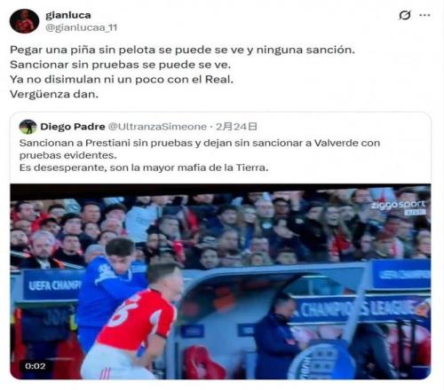 本菲卡的上訴沒有得到歐足聯(lián)的支持,隨后球員就在社交媒體上表達了不滿,直接炮轟歐足聯(lián):“無球狀態(tài)下的惡意犯規(guī)可以視而不見,不予處罰。沒有證據的判罰卻可以照給不誤。他們對皇馬的偏袒已經毫不掩飾了。真是無恥。”普雷斯蒂安尼所說的惡意犯規(guī),指的是首回合的比賽當中,巴爾韋德在無球對抗的情況下?lián)舸蛄吮痉瓶ㄇ騿T達爾頭部的動作,本菲卡同樣對這一行為進行了投訴,但是沒有獲得支持。