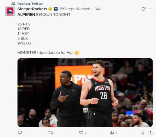 此役阿爾佩倫-申京表現非常出色,首節9分鐘里他就已經3中3拿到6分4籃板4助攻,次節9分鐘里更是6中3+三分1中1拿到12分5籃板3助攻,半場18分9籃板7助攻1搶斷1蓋帽1失誤,真實命中率77.3%,正負值+24。國王的內線群根本無法限制他分毫。