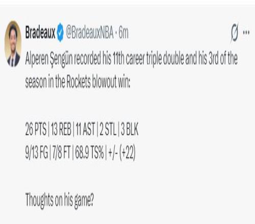 休媒曬出申京此役的數據,盛贊此役他拿到了怪物一般的三雙數據。本賽季申京場均6.3助攻實際是火箭的第一組織進攻點,他繼續朝著約基奇的方向進發。