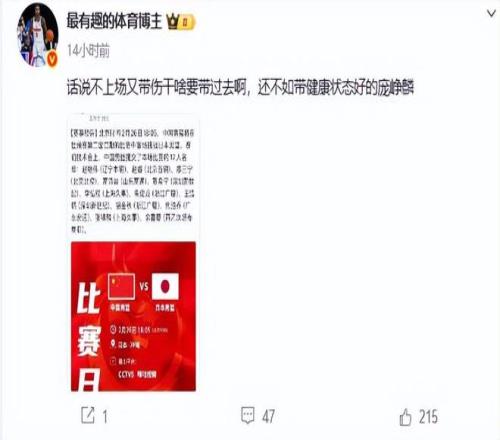 但是問題來,既然胡明軒達(dá)不到打比賽的要求,郭士強(qiáng)為何要帶上他?媒體人最有趣的體育博主,對(duì)此也非常不滿,直接噴郭士強(qiáng),他說,“話說不上場(chǎng)又帶傷干啥要帶過去啊,還不如帶健康狀態(tài)好的龐崢麟”。媒體人說的非常有道理,既然胡明軒達(dá)不到比賽要求,為何要帶上他?帶上健康和狀態(tài)均好的龐崢麟不比胡明軒好嗎?可見郭士強(qiáng)的操作就是作死,膽子還是小了一點(diǎn),人也太固執(zhí)了,不少人認(rèn)為龐崢麟是最適合打日本隊(duì)的隊(duì)員,他速度快,既能突破又有三分,對(duì)方對(duì)他也不了解,為何不能膽子大一些帶上他?