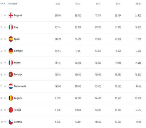 目前的歐戰(zhàn)積分中,英格蘭21.902分?jǐn)鄼n領(lǐng)先,德甲、西班牙、意大利和葡萄牙分列2-5位,法國排在第6。