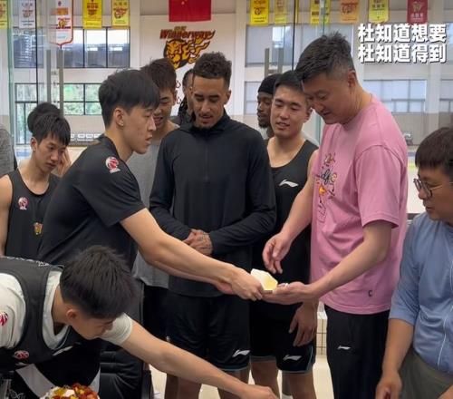 準備活動結束,杜鋒還是獲得了足夠的尊重。李文昊特地切了一塊蛋糕給杜鋒,這就是杜鋒在隊內的地位。之前也出現過年輕球員給杜鋒切蛋糕的情況,他對于年輕球員的幫助還是比較大的。
