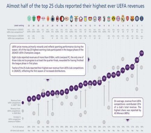 在這25家俱樂部中,有12家在2024-25賽季報告了其在歐足聯(lián)俱樂部比賽中有史以來最高的收入,這反映了分配增加的首個賽季。