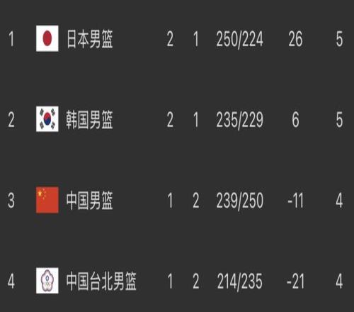 在另一場比賽中,韓國隊意外落敗,以65-77輸給中國臺北。在CBA效力的陳盈駿全場13分5板4助,林庭謙18分3板,劉錚10中1,得到3分4板3助3搶斷。在目前的小組積分榜上,日本、韓國同為2勝1負,排名前2位,中國隊1勝2負第3,中國臺北隊1勝2負墊底。