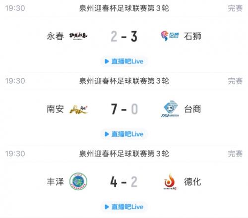 體育播報02月26日宣 泉州市首屆“迎春杯”足球聯賽今天結束第3輪比賽的全部爭奪,石獅讓二追三讀秒絕殺永春,南安7-0大勝臺商,豐澤4-2逆轉德化。本文為大家帶來每場比賽的進球動圖和積分榜情況。