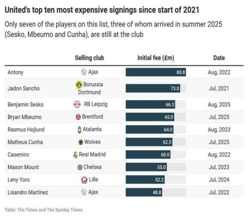 泰晤士報:曼聯過去五年凈轉會支出全球第一,總額約6.92億英鎊