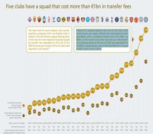 “截至2025財年,切爾西的一線隊陣容以17.46億歐元的累計轉會成本,正式成為歷史上組建成本最高的陣容,比俱樂部去年創下的紀錄高出9000萬歐元。”