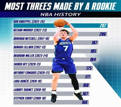 單場命中8記三分追平其個人生涯紀錄,憑借這樣的表現,克努佩爾本賽季已經命中209記三分,不僅高居本賽季全聯盟第一,也讓其超越基根-穆雷的206記三分,創造新的NBA歷史新秀單賽季三分命中數紀錄。