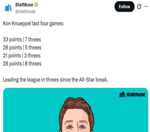 更讓人眼前一亮的是,克努佩爾幾乎沒有遭遇新秀墻,反而開季至今狀態一路呈現出上揚勢頭,全明星后的5場比賽克努佩爾合計命中多達26記三分高居同期聯盟第一。