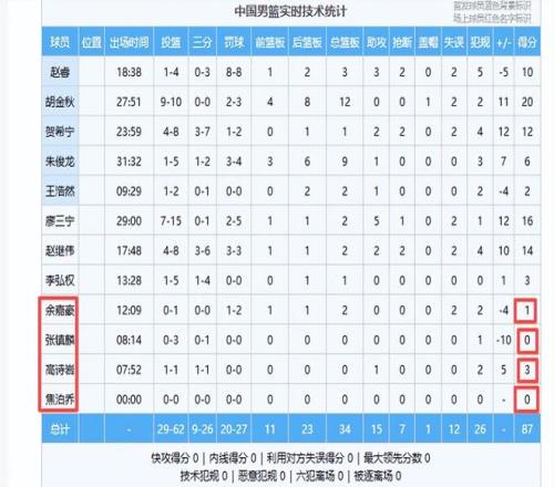 主帥郭士強第一節輪換了10名隊員,第二節輪換了11名隊員。焦泊喬成為唯一不上場的隊員。下半場郭士強實行了短輪換,張鎮麟、王浩然、李弘權遭到棄用,余嘉豪也是僅僅打了12分鐘,下半場使用也不多。王浩然屬是新兵,僅得2分可理解,李弘權也是新人,第一次打國家隊,僅得3分,也不必多吐槽。最糟糕的就是在國家隊打了多年比賽的張鎮麟,事實證明已越來越不中用。全場他僅打了8分鐘,除高詩巖外他上場時間最少,也是全隊正負值最低的球員,在場輸10分。